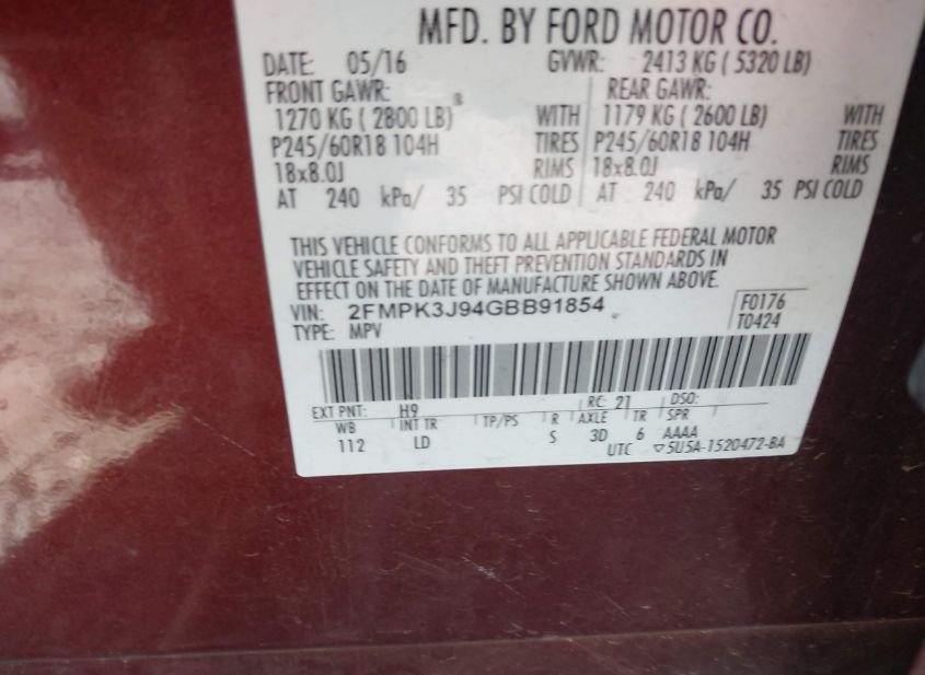 - VIN: 2FMPK3J94GBB91854