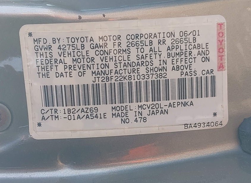 - VIN: JT2BF22K810337382