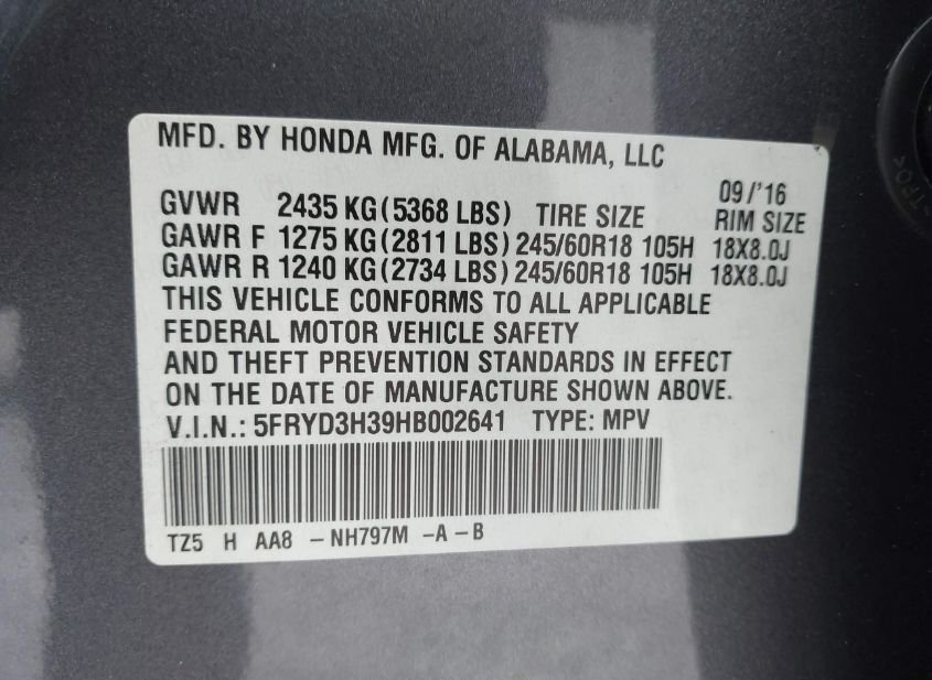 - VIN: 5FRYD3H39HB002641