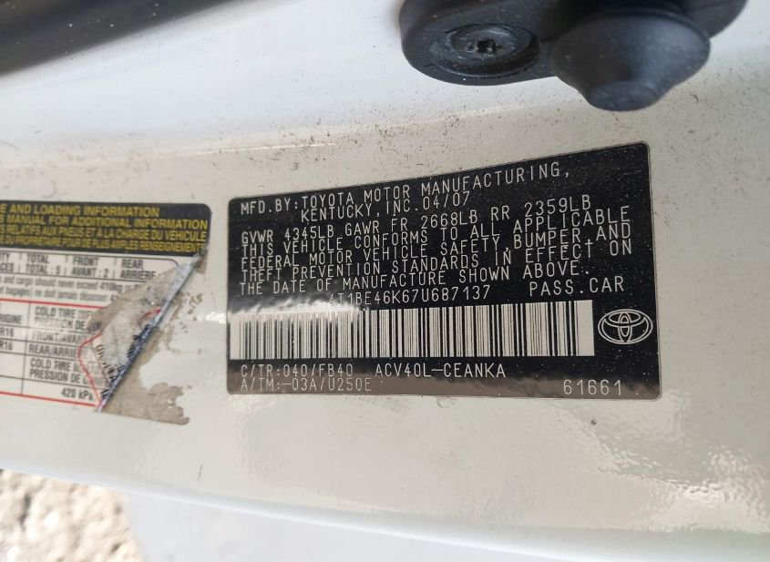 - Название лота: 2007 TOYOTA CAMRY LE