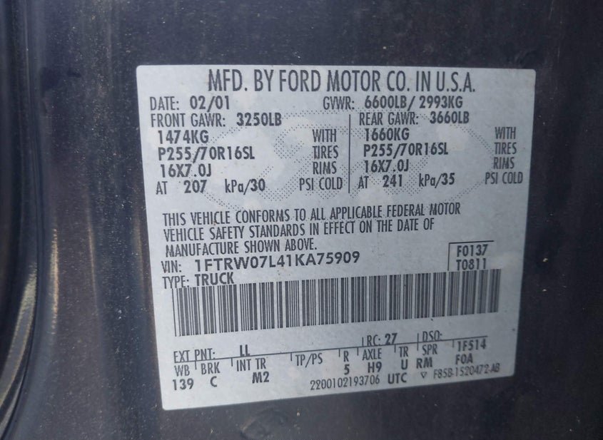 - VIN: 1FTRW07L41KA75909