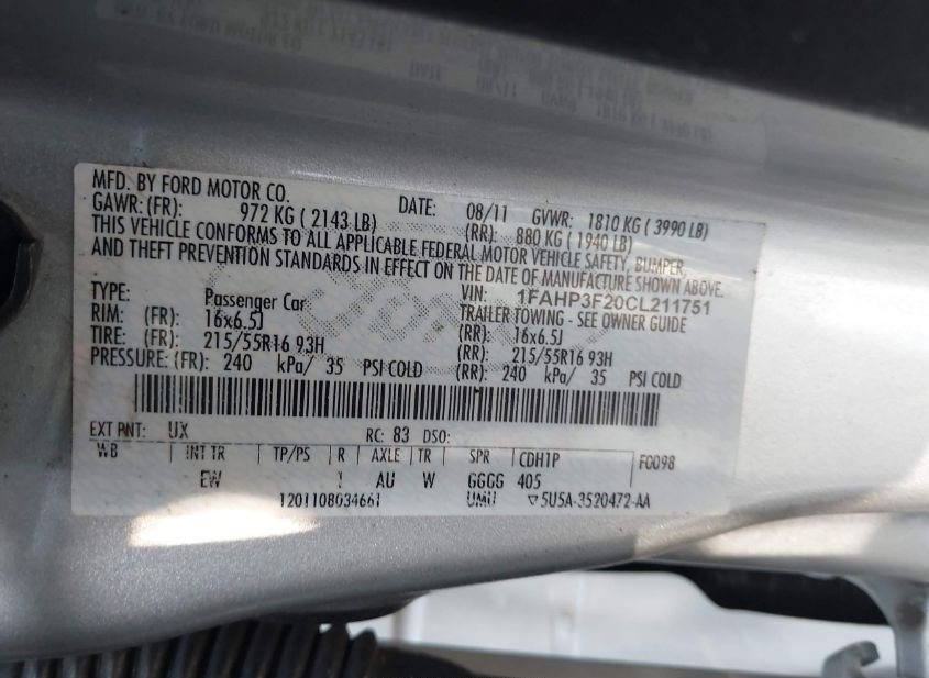- VIN: 1FAHP3F20CL211751