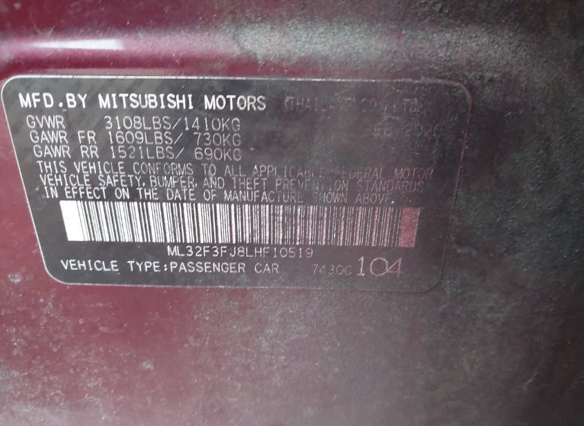 - Название лота: 2020 MITSUBISHI MIRAGE G4 ES