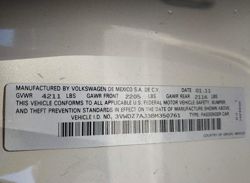 - VIN: 3VWDZ7AJ3BM350761
