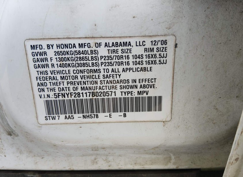 - VIN: 5FNYF28117B020571