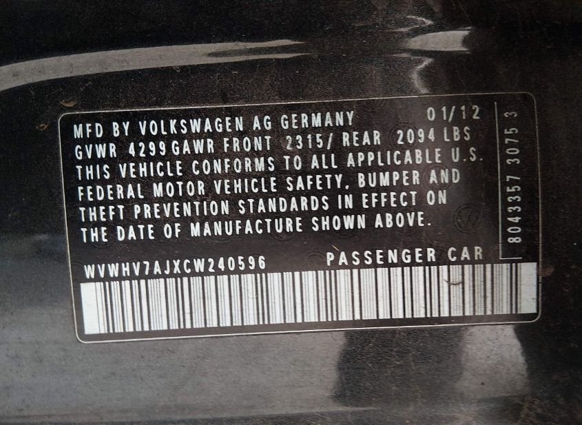 - VIN: WVWHV7AJXCW240596