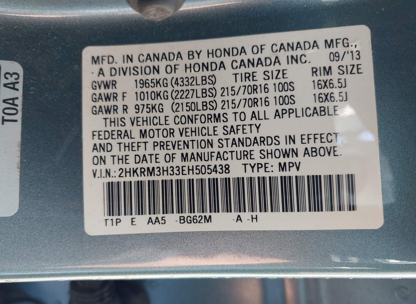 - VIN: 2HKRM3H33EH505438
