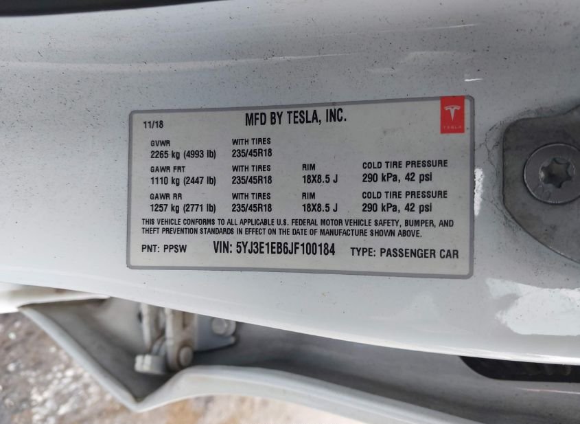 - VIN: 5YJ3E1EB6JF100184