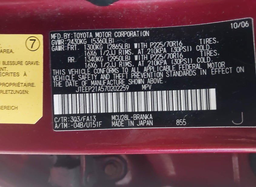 - VIN: JTEEP21A570202259