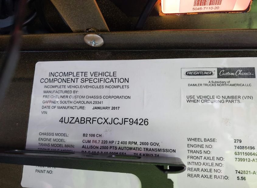 - VIN: 4UZABRFCXJCJF9426