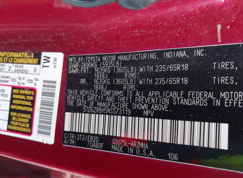 - VIN: 5TDGZRBH5NS573119