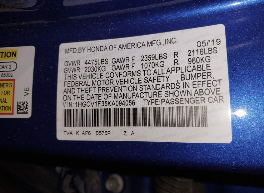 - VIN: 1HGCV1F35KA094056