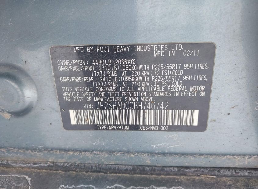 - VIN: JF2SHADC0BH746742