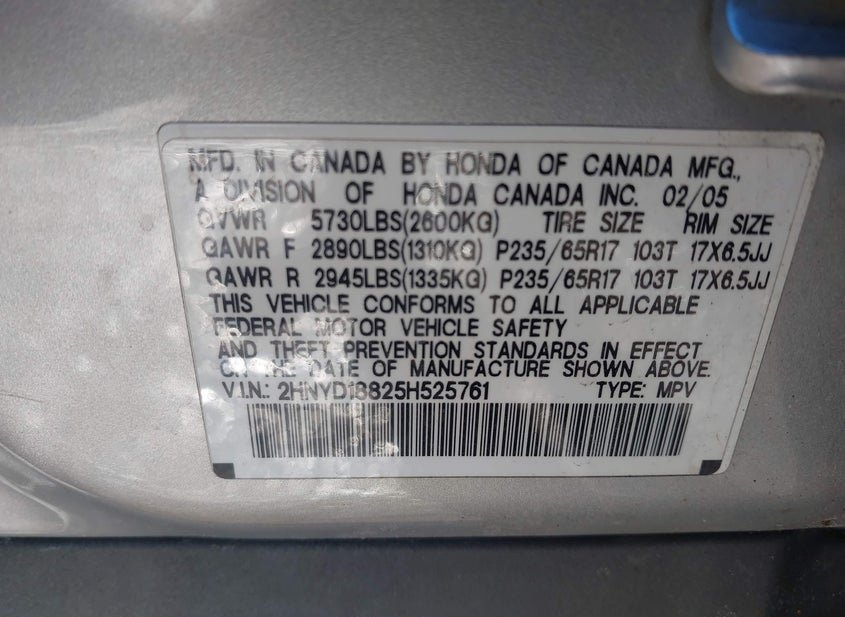 - VIN: 2HNYD18825H525761