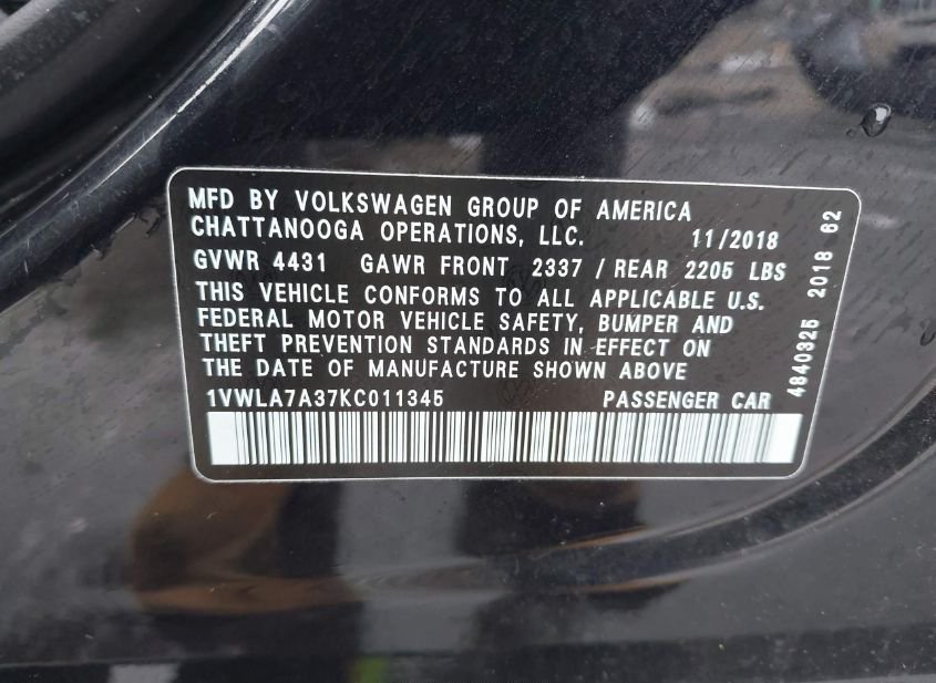 - VIN: 1VWLA7A37KC011345