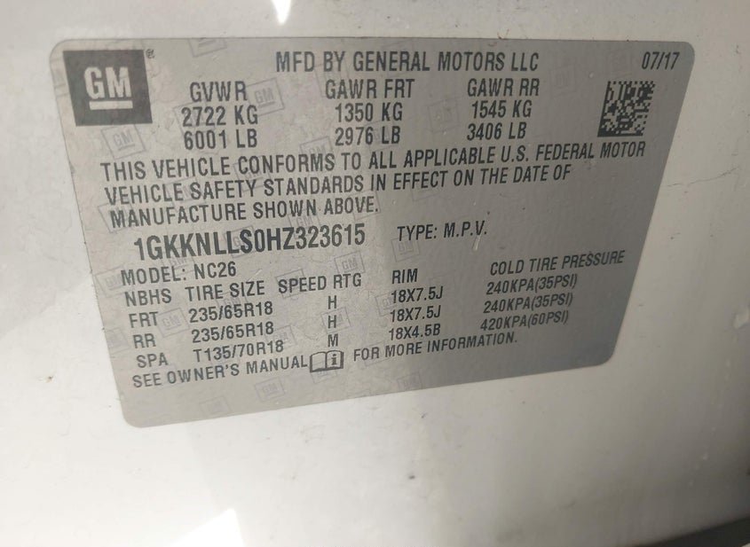 - VIN: 1GKKNLLS0HZ323615