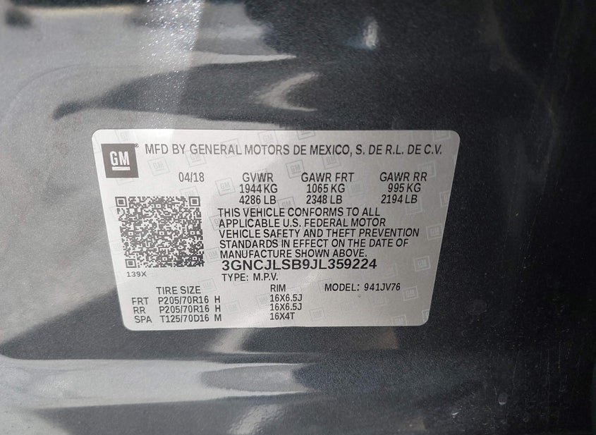 - VIN: 3GNCJLSB9JL359224