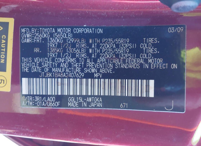 - VIN: JTJBK1BA8A2407629