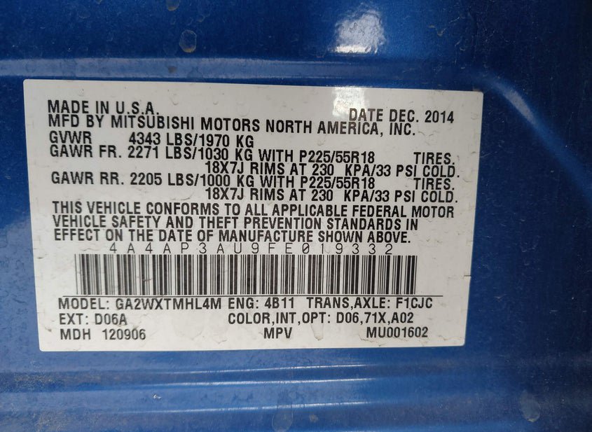 - Название лота: 2015 MITSUBISHI OUTLANDER SPORT ES