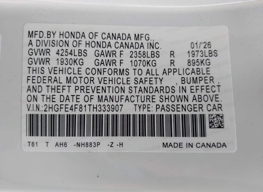 - VIN: 2HGFE4F81TH333907