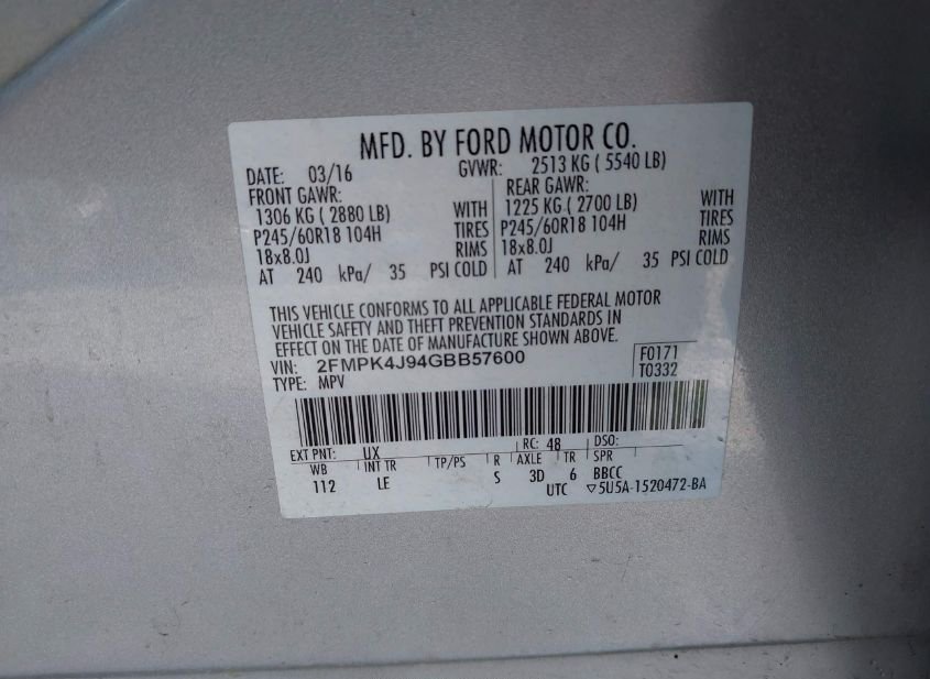- VIN: 2FMPK4J94GBB57600