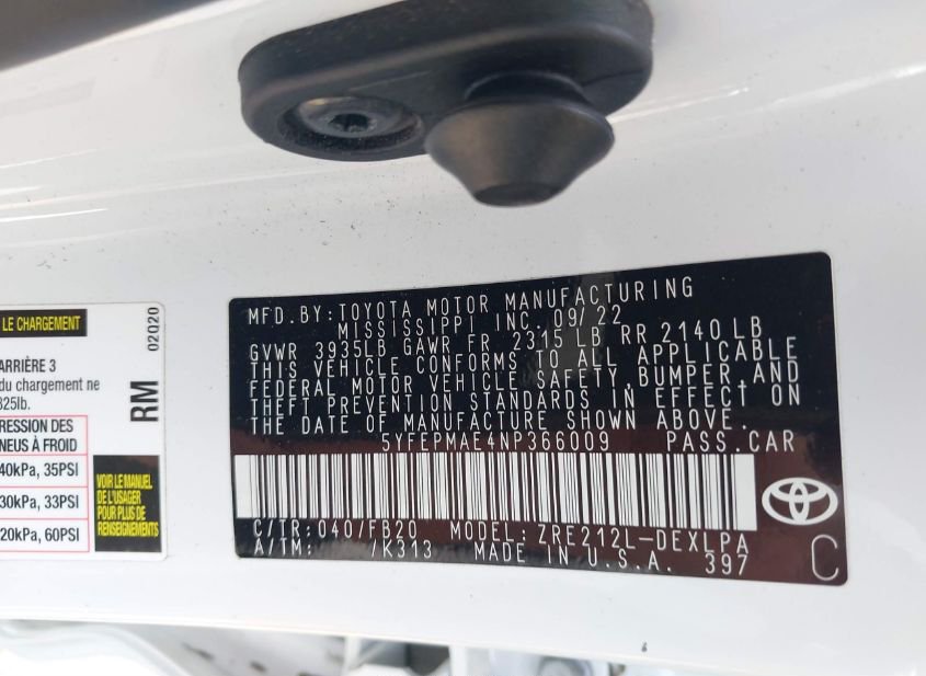 - VIN: 5YFEPMAE4NP366009
