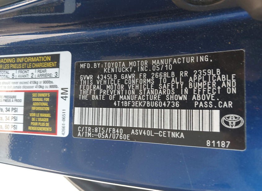 - VIN: 4T1BF3EK7BU604736
