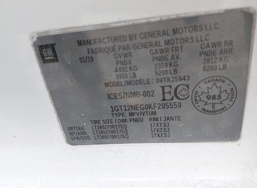 - VIN: 1GT12NEG0KF205559