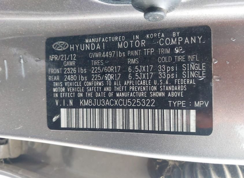 - VIN: KM8JU3ACXCU525322