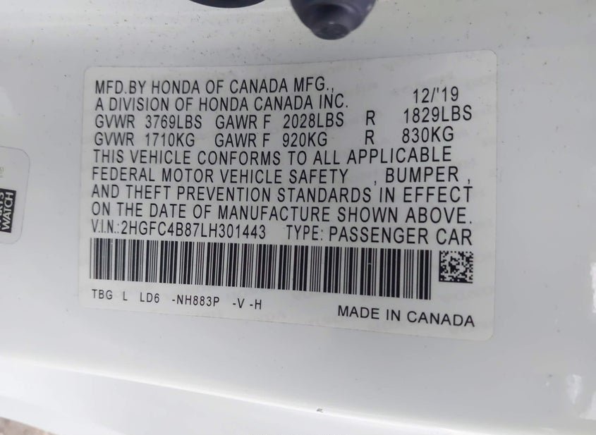 - VIN: 2HGFC4B87LH301443