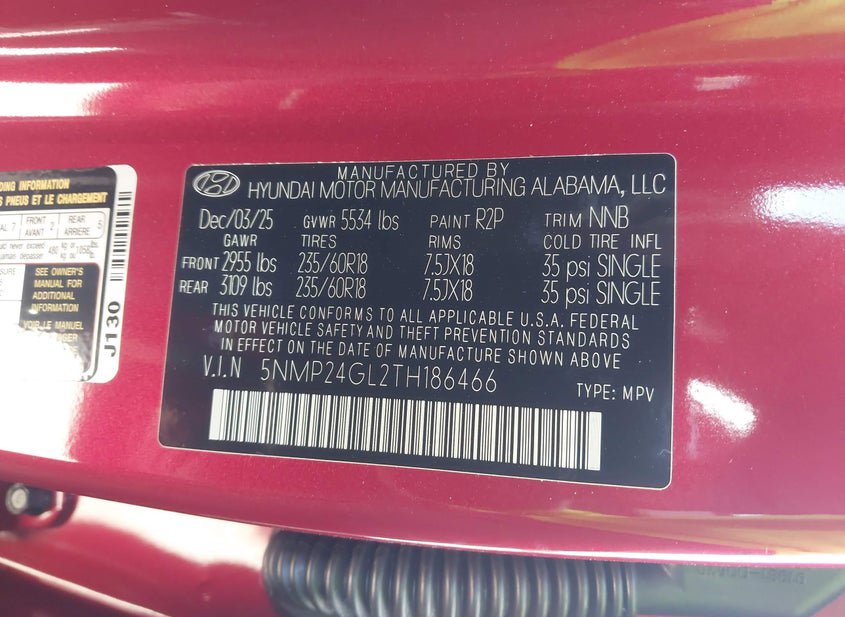 - VIN: 5NMP24GL2TH186466