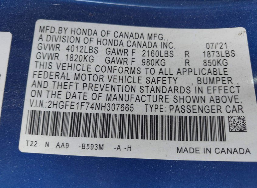 - VIN: 2HGFE1F74NH307665