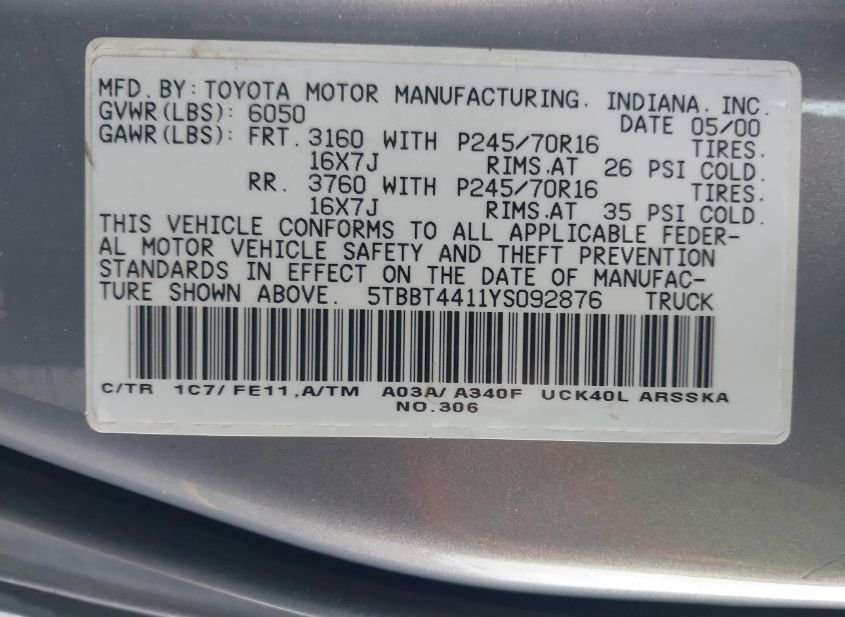 - VIN: 5TBBT4411YS092876