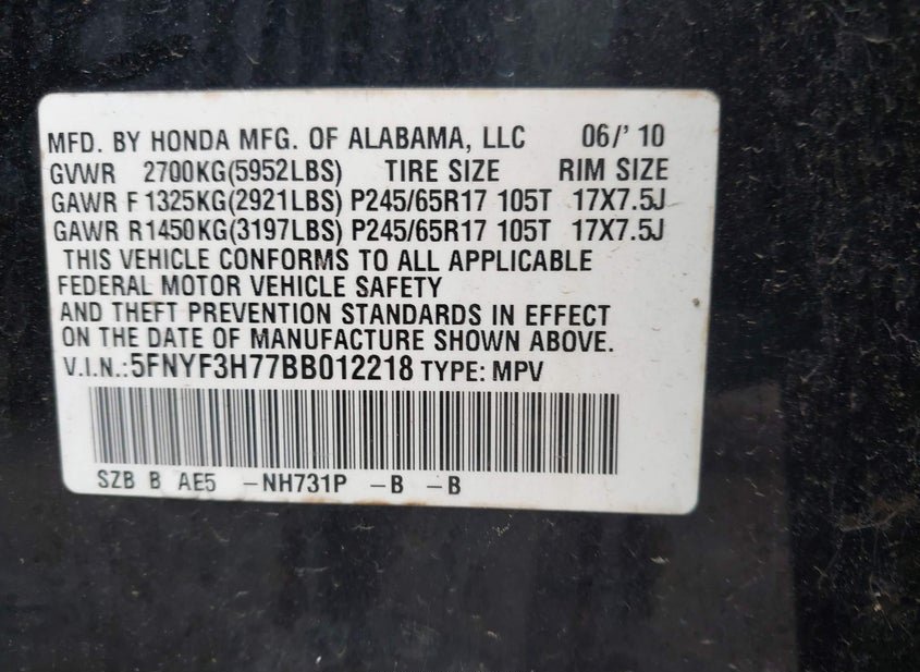 - VIN: 5FNYF3H77BB012218