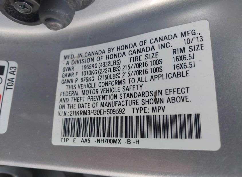 - VIN: 2HKRM3H30EH509592