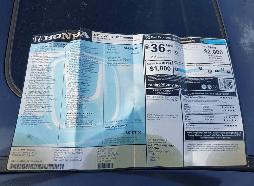 - Название лота: 2017 HONDA CIVIC TOURING