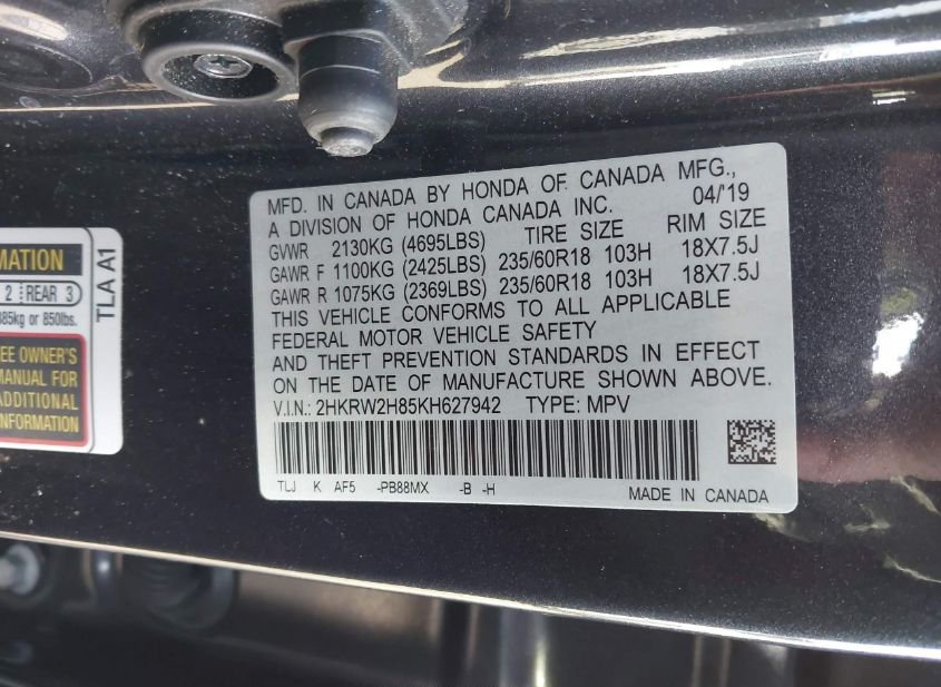 - VIN: 2HKRW2H85KH627942