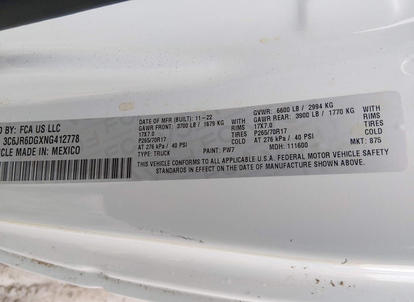 - VIN: 3C6JR6DGXNG412778