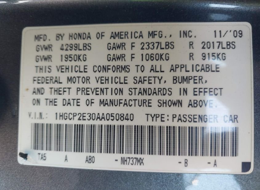 - VIN: 1HGCP2E30AA050840