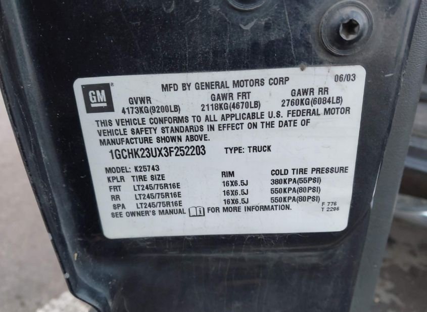 - VIN: 1GCHK23UX3F252203