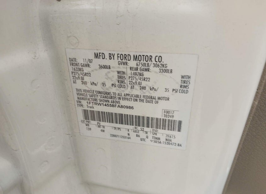 - VIN: 1FTRW14558FA80986
