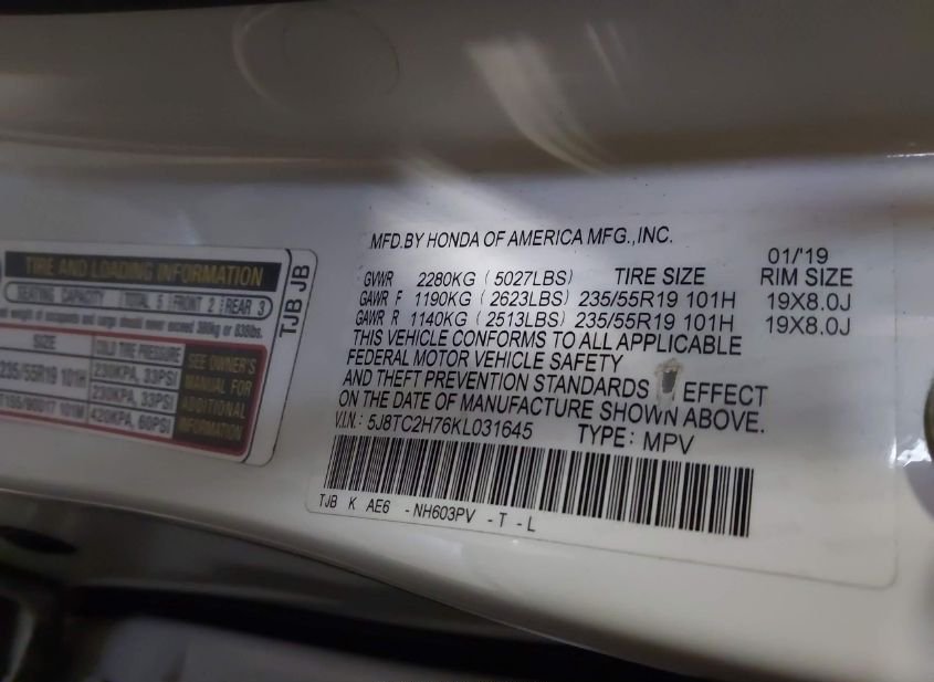- VIN: 5J8TC2H76KL031645