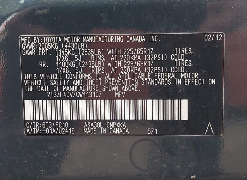 - VIN: 2T3ZF4DV7CW113107