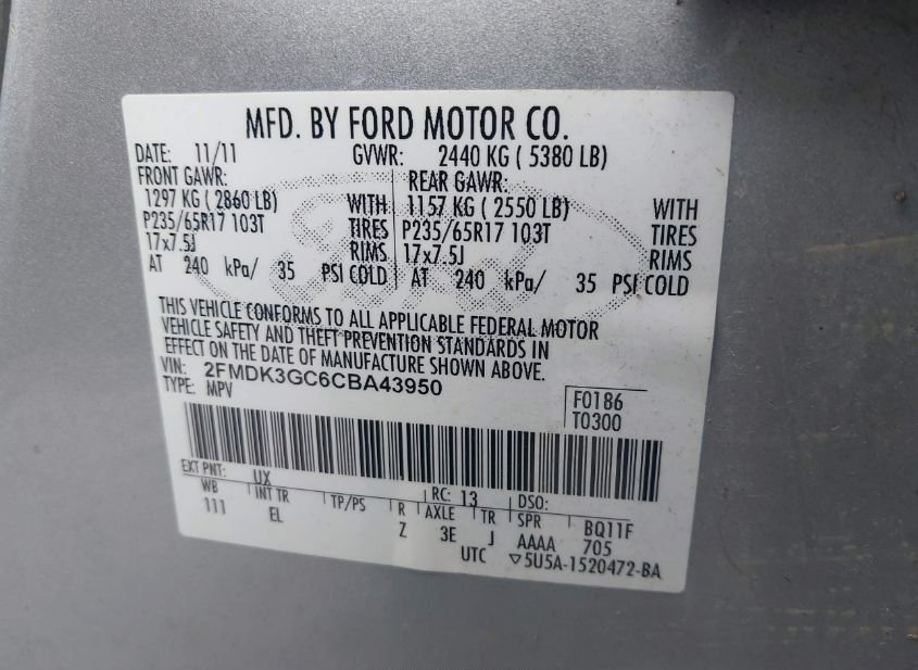 - VIN: 2FMDK3GC6CBA43950