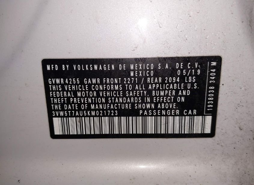 - VIN: 3VW5T7AU5KM021723