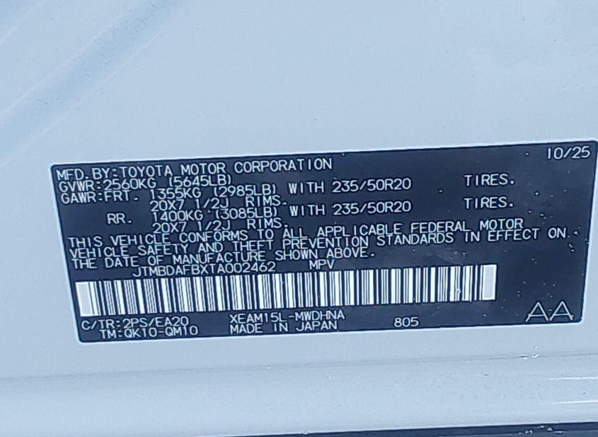 - VIN: JTMBDAFBXTA002462