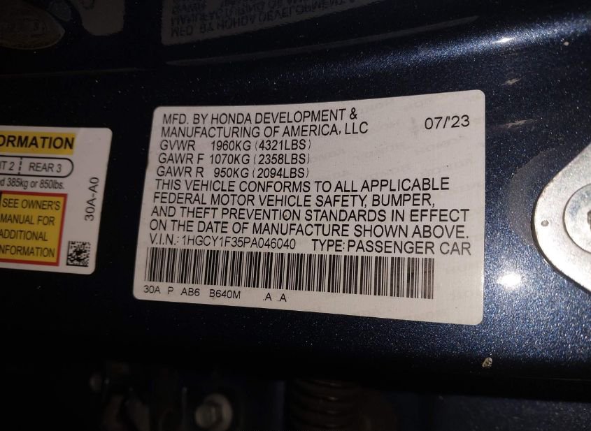- VIN: 1HGCY1F35PA046040