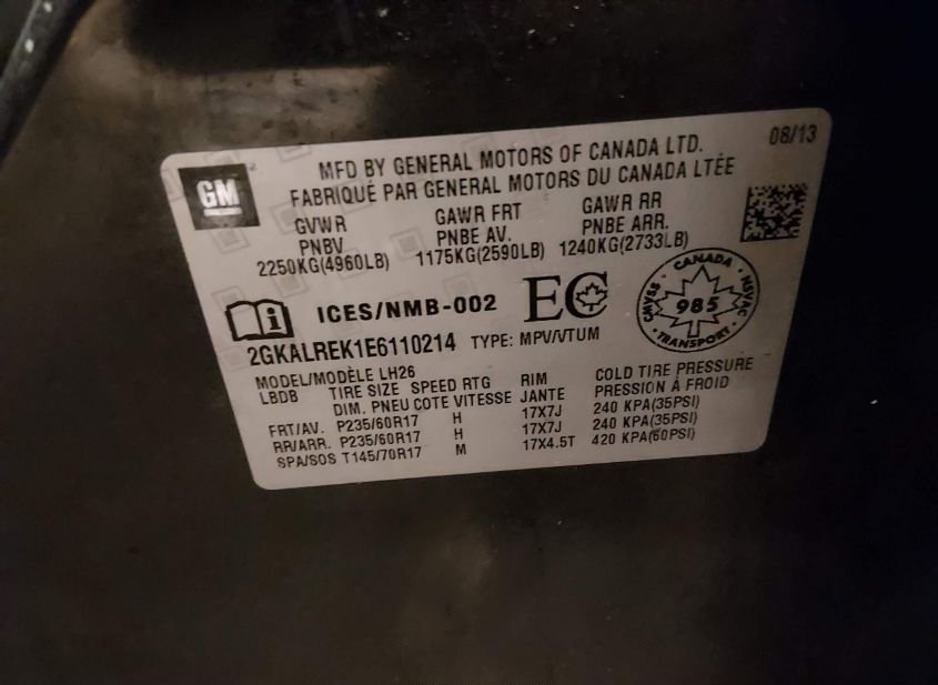 - VIN: 2GKALREK1E6110214
