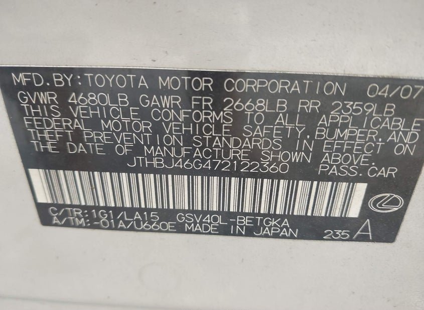 - VIN: JTHBJ46G472122360