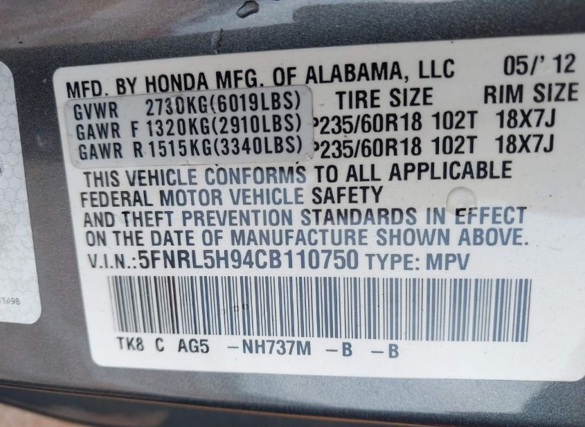 - VIN: 5FNRL5H94CB110750